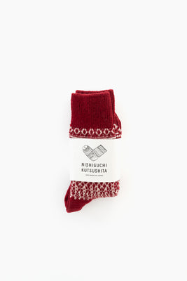 Small - $57.00 NZD Medium - $57.00 NZD Large - $57.00 NZD Sold Out Add to Bag Small Medium Large NISHIGUCHI KUTSUSHITA Wool Jacquard Socks, Wine $57.00