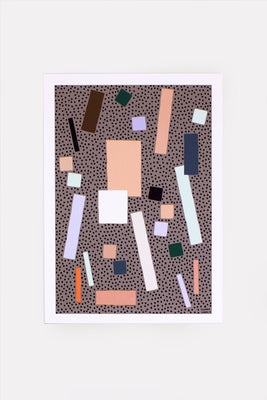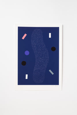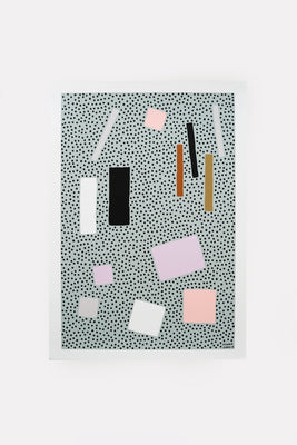 Made in Helsinki, this calming abstract print with simple shapes and flat colors leaves the viewer's imagination to roam: Is this the image of a school of fish moving between bobbing watercrafts on a quiet and deep sea, or perhaps a flock of birds taking flight above the cityscape? This thought-evoking print makes for a work of art fitting for any age in any space.
