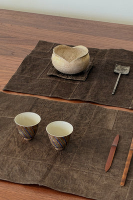 Hand-stitched coaster created by artist Yoshimi Kudo, made from persimmon-dyed linen in deep earthy tones. Subtle patchwork details highlight the maker’s hand.