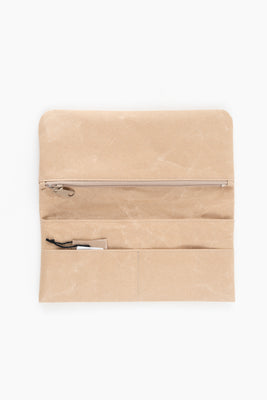 Designed by iconic Japanese designer Naoto Fukasawa in collaboration with thousand year old washi paper making company ONAO, this long wallet folds open to reveal pouches for cards, bills, and a zip compartment for coins and other belongings.